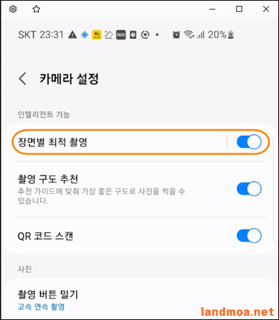 설정화면에서 [장면별 최적 촬영]을 활성화 시키고, 해당 글자를 터치합니다.