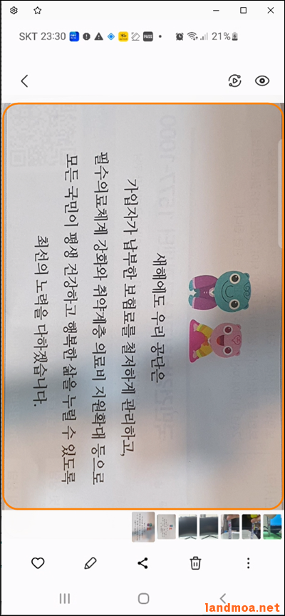 처음에는 단순히 문서를 촬영한 것이지만, 영역을 지정해 스캔을 완료하면, 원근감이 없어지고 스캔한 문서로 다시 태어나게 됩니다. 문서를 저장하거나 이메일 등으로 문서 제출이 필요할 때 할용하시면 도움이 될 것으로 봅니다.