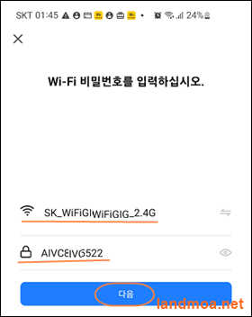 사용하는 와이파이를 선택하시고 비밀번호를 선택하고 [다음] 버튼을 선택합니다.