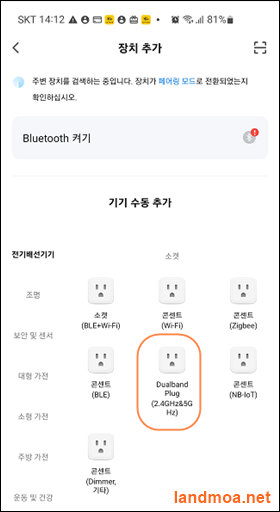 [장치추가] 화면의 [기기수동추가] 부분에서 [Duaband Plug 2.4GHz&5GHz]를 선택합니다.