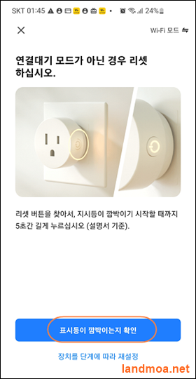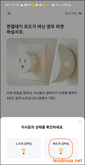 만약, 멀티탭에서 주스위치를 5초이상 눌러도 표시등이 느리게 깜빡인다면, 빠르게 깜빡일 때까지 다시 시도해야 합니다.