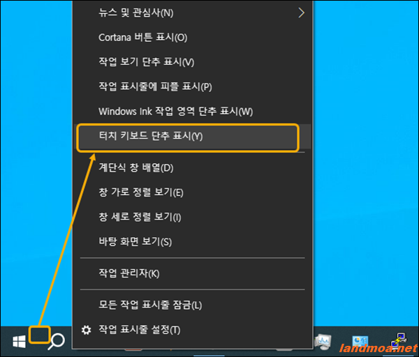 윈도우즈의 바탕화면 하단에 있는 작업표시줄에 마우스를 위치합니다. 마우스 우측 버턴을 클릭하시면 퀵메뉴가 나옵니다. 이 메뉴에서 [터치 키보드 단추표시]를 선택합니다.