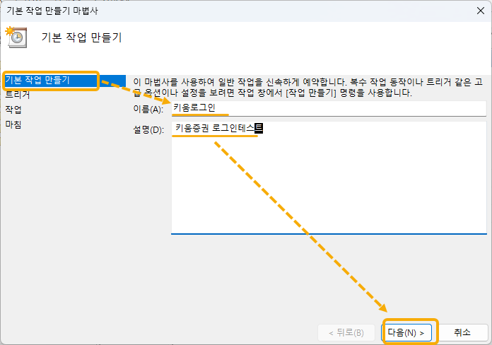 작업 스케줄러 창이 열리면, 우측 부분에서 [기본작업만들기[를 선택합니다.