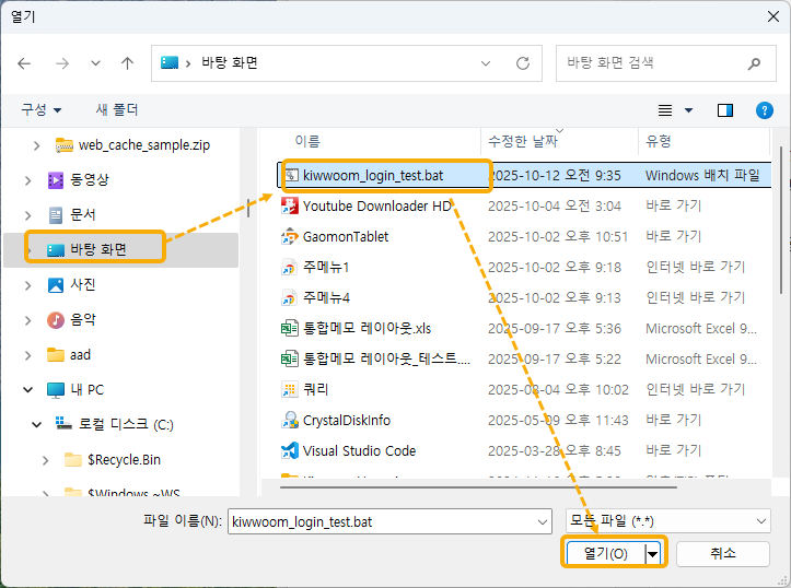 메모장에서 만든 bat 파일을 찾아 선택합니다.